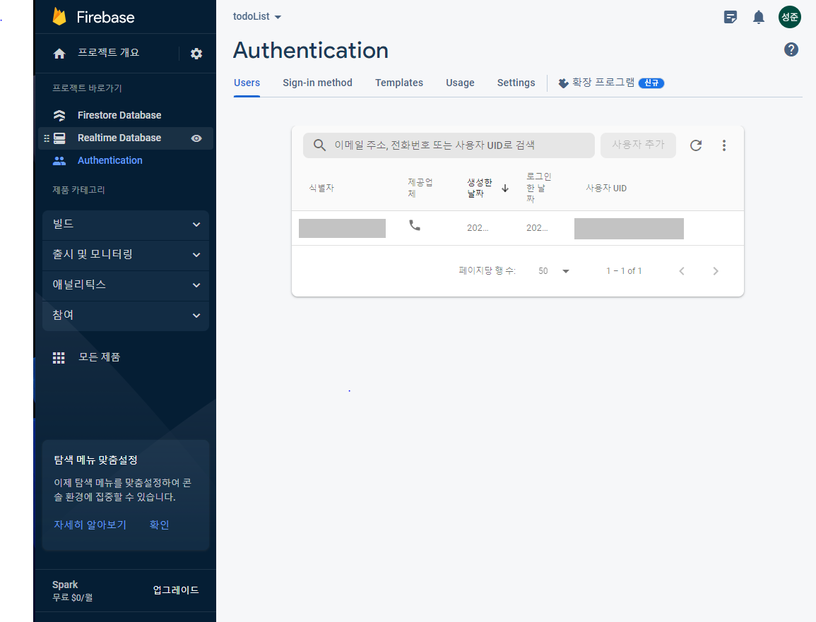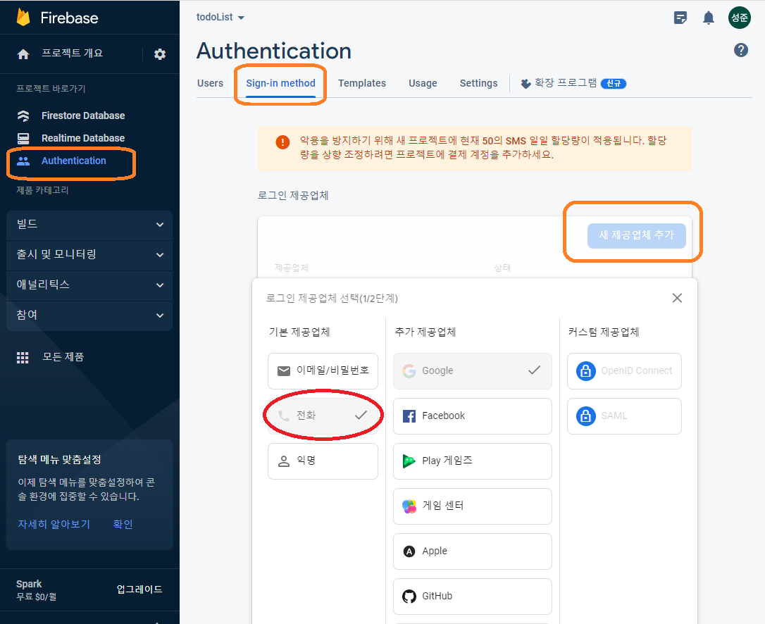 1. 파이어베이스auth접속 -> sign-in method에서 전화인증 사용설정