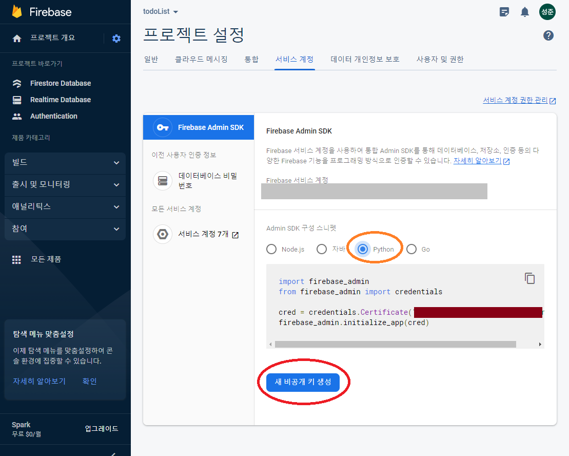 프로젝트설정 -> 서비스 계정 -> 새 비공개키 생성